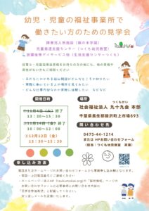 九十九会では12月12日(金)13:30~「幼児・児童の福祉事業所で働きたい方のための見学会」を行います。